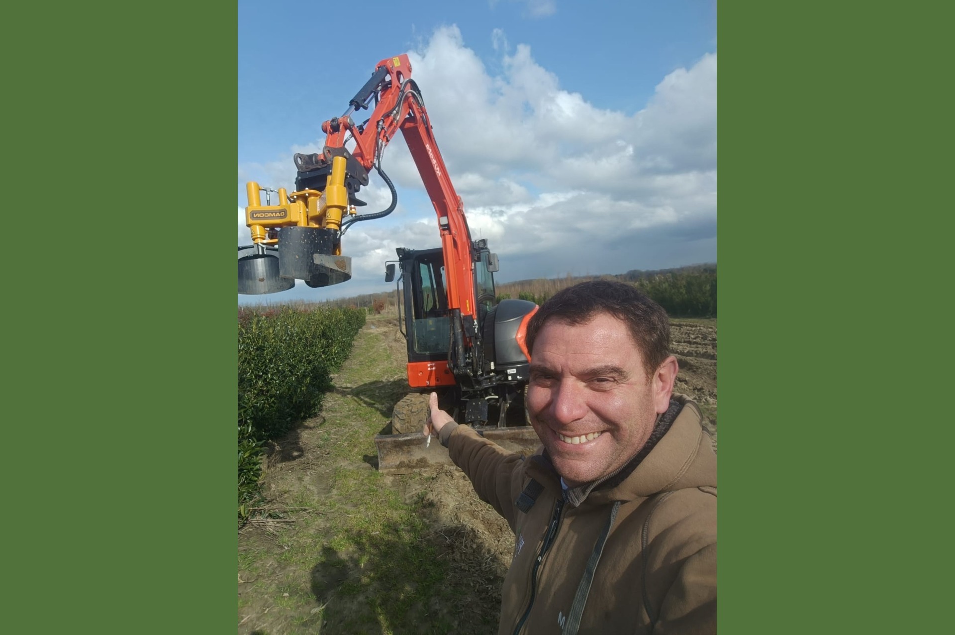 Frühlingssonne auf dem Kopf… schön Prunus ausroden mit einem Kubota Minibagger und dem Damcon KLR-300M ST. Wer macht hier was? Wenn Sie solche Pflanzen ausroden, haben Sie als Baumschulgärtner den besten Job der Welt.