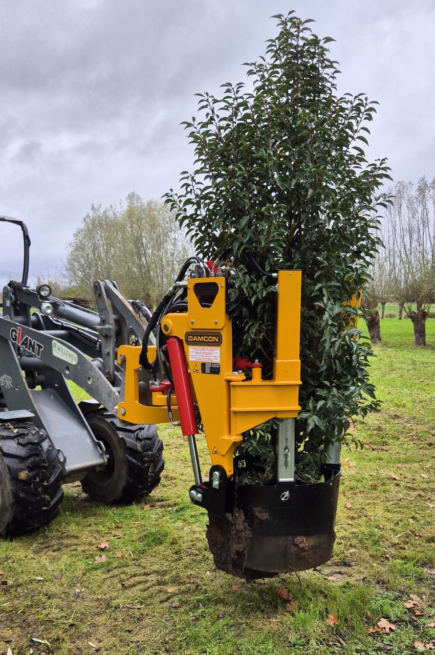 Funktionsweise: Die Spaten gehen um den Baum herum, schließen sich und gehen nach unten. Das Unterschneidemesser schneidet unter den Ballen, kehrt zur Mitte des Ballens zurück und hebt den Ballen mit Baum an. Das funktioniert auch gut bei tiefen Wurzeln. Die Spaten sind einstellbar.