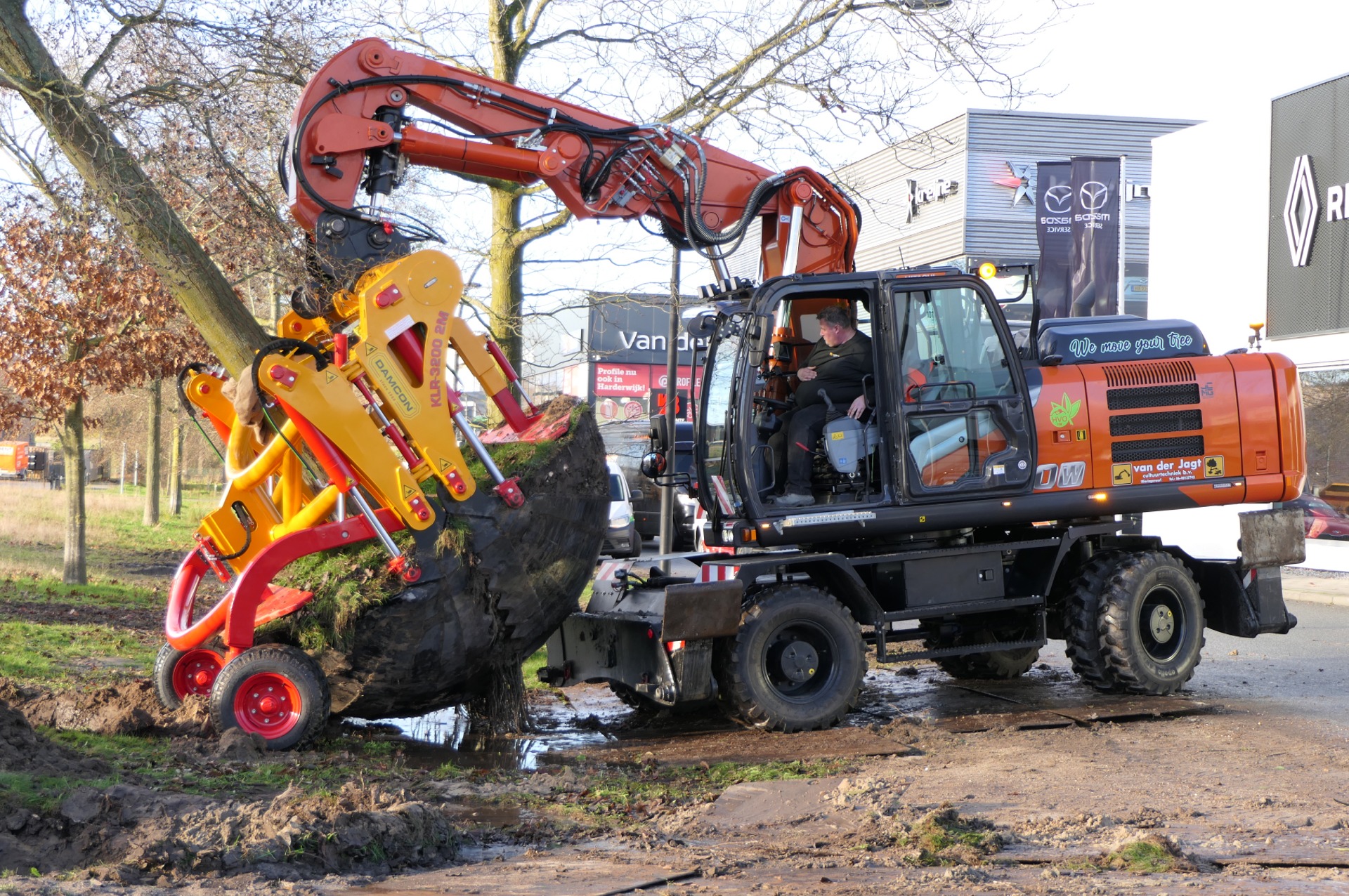 Es ist immer noch ein faszinierender Anblick! Das Verpflanzen großer Bäume mit einer Damcon Baumverpflanzer KLR-3200 2M.