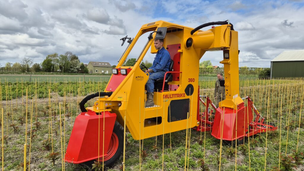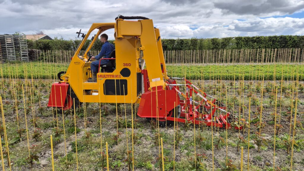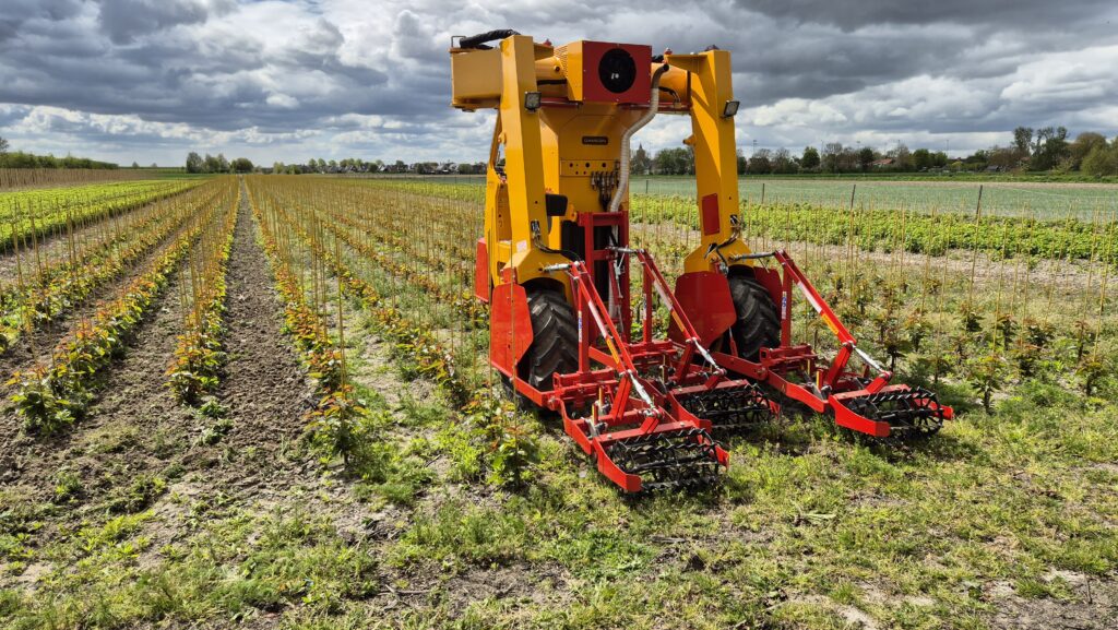 Frisch an Koster Boomkwekerij VOF ausgeliefert: dieser wunderschöne Portaltraktor HWD-360. Der Portaltraktor ist mit 3 Hackmaschinen mit Torsionhacke für einen Reihenabstand von 0,80 m ausgestattet.
